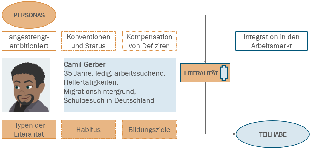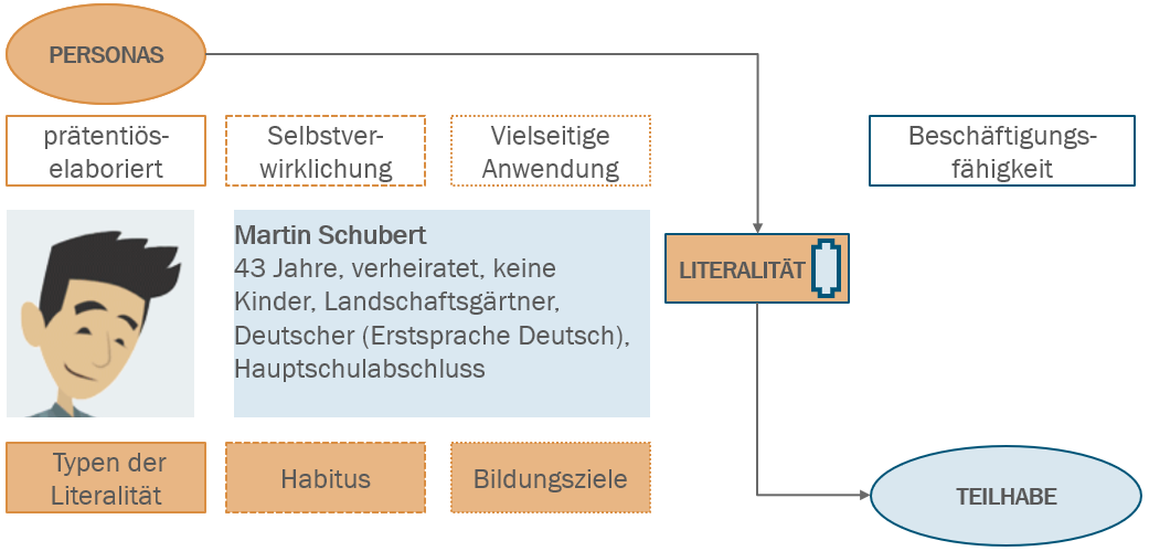 Aufgrund von Grundbildungsdefiziten (Sprache, Schriftsprache, Mathematik) ist er wenig selbstbewusst. Gegenüber digitalen Medien ist er sehr aufgeschlossen (Spaßfaktor). Er bringt auch eine hohe Lernbereitschaft mit. Denn er möchte seine schriftsprachlichen Defizite ausgleichen und eventuell den Führerschein machen. Er ist an einem Kursangebot interessiert, in dem er sich wohl fühlt und nette Leute kennen lernen kann.