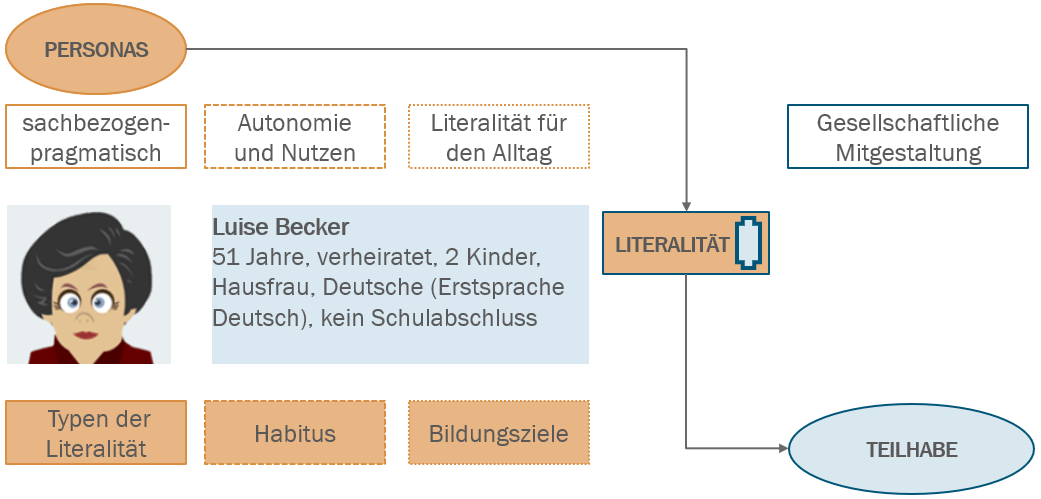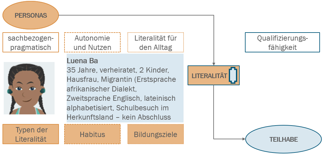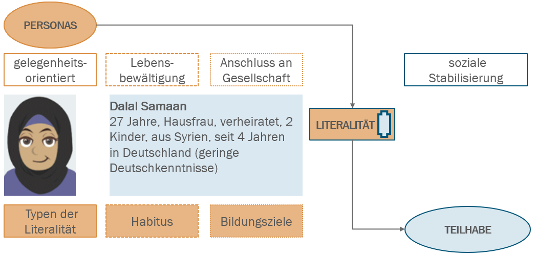 Aktuell steht für sie die Bewältigung ihrer prekären Lebenssituation im Vordergrund. Langfristig möchte sie Anschluss an die Gesellschaft finden. Deutsch und Schriftsprache sind für sie der Schlüssel dazu. Ein niederschwelliges Kursangebot könnte ihrem Alltag Struktur geben. Obwohl sie aufgrund ihrer familiären Verpflichtungen wenig Zeit zum Lernen hat, schätzt sie gemeinsame Aktivitäten mit anderen Teilnehmenden. Sie hat wenig Medienerfahrung, ist aber offen für Neues.