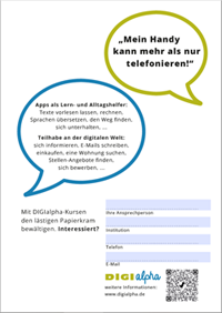 Um Ihre Kund*innen über die Gestaltung für sie geeigneter Lernangebote zu informieren, können Sie ihnen über den QR-Code auf den Postkarten per Smartphone oder über Link am PC und Laptop einen kurzen Animationsfilm zum DIGIalpha Kursangebot zeigen: